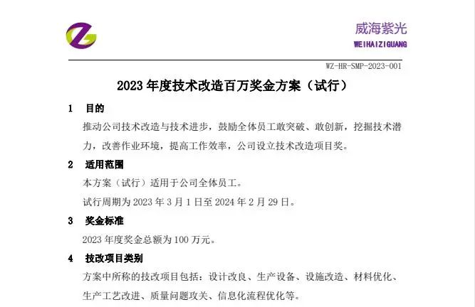 In order to promote the company's technological transformation and technological progress, and cultivate the sense of ownership of employees, Weihai Ziguang launched the 2023 annual technological transformation million bonus plan in March this year. Through the heavy reward policy, it stimulated the innovation vitality of employees, integrated the wisdom of all employees, stirred up a "brain storm", and made "golden idea" the "golden key" to achieve efficiency.